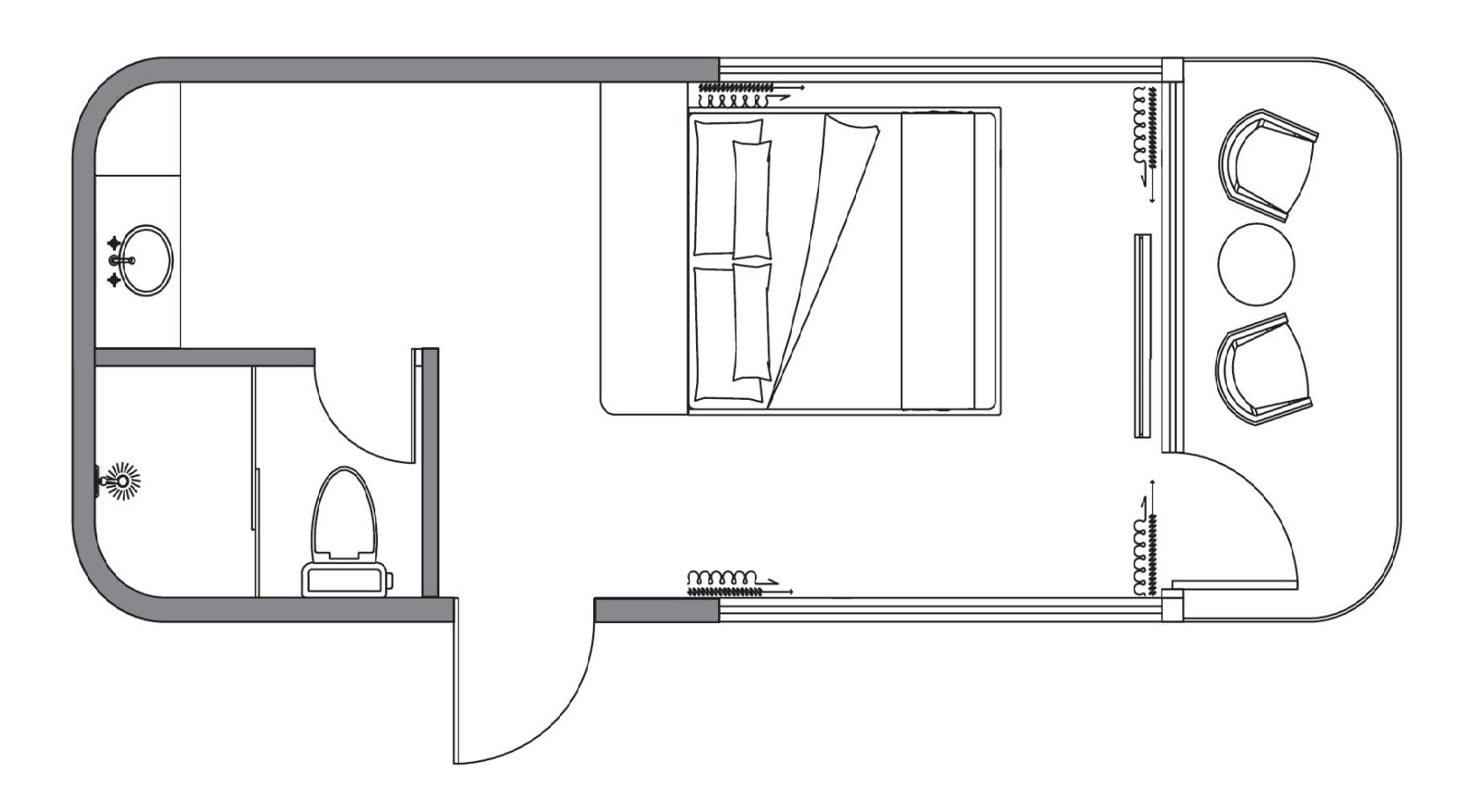Smart layout packs bathroom, sleeping, and storage into limited space.